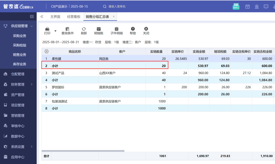 3.財(cái)貿(mào)ERP還支持按存貨、客戶、供應(yīng)商、部門、經(jīng)手人、項(xiàng)目等關(guān)鍵維度生成二維式分組匯總報(bào)表,清晰展示數(shù)據(jù)關(guān)聯(lián),并自動(dòng)完成分組小計(jì)。用戶可通過顏色標(biāo)注重點(diǎn)數(shù)據(jù),快速篩選異常或重點(diǎn)關(guān)注記錄,實(shí)現(xiàn)多角度、可視化的業(yè)務(wù)分析。