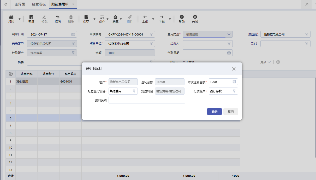 ③ 返現,通過購銷費用單(銷售費用)—操作—使用返利來處理。如圖5所示。